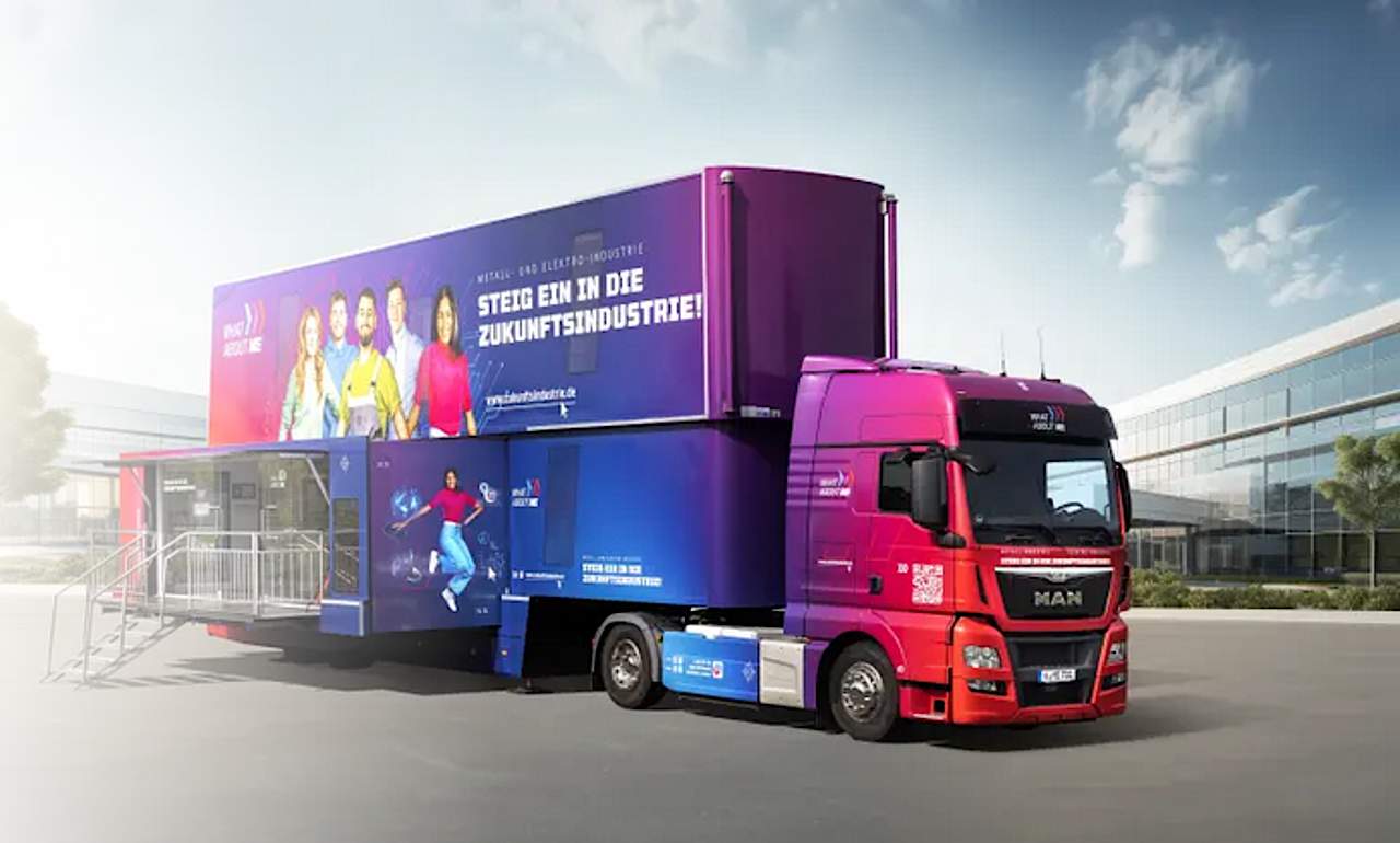 Darüber hinaus besteht die Möglichkeit, den InfoTruck an die von Ihnen gewünschte Stelle zu lotsen, etwa an eine bestimmte Schule oder in ein Unternehmen. Buchen Sie hier den M+E-Info-Truck – kostenfrei.